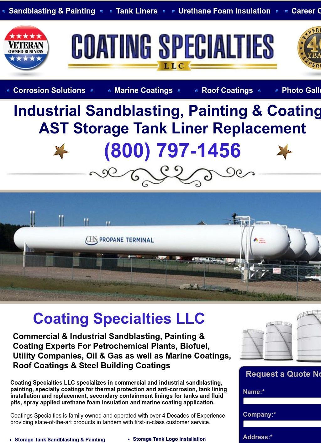 Coating Specialties LLC is a full service commercial/industrial storage tank sandblasting, painting, coating and AST Storage Tank Liner Replacement services in California, Texas, Florida, New York, New Jersey, Georgia, North Carolina, South Carolina, Maryland, Virginia, Oregon, Washington, Massachusetts, Connecticut, Rhode Island, New Hampshire, Vermont, Maine, Virginia, Minnesota, Wisconsin, Michigan, Illinois, Oklahoma, Kansas and many other communities in the U.S.