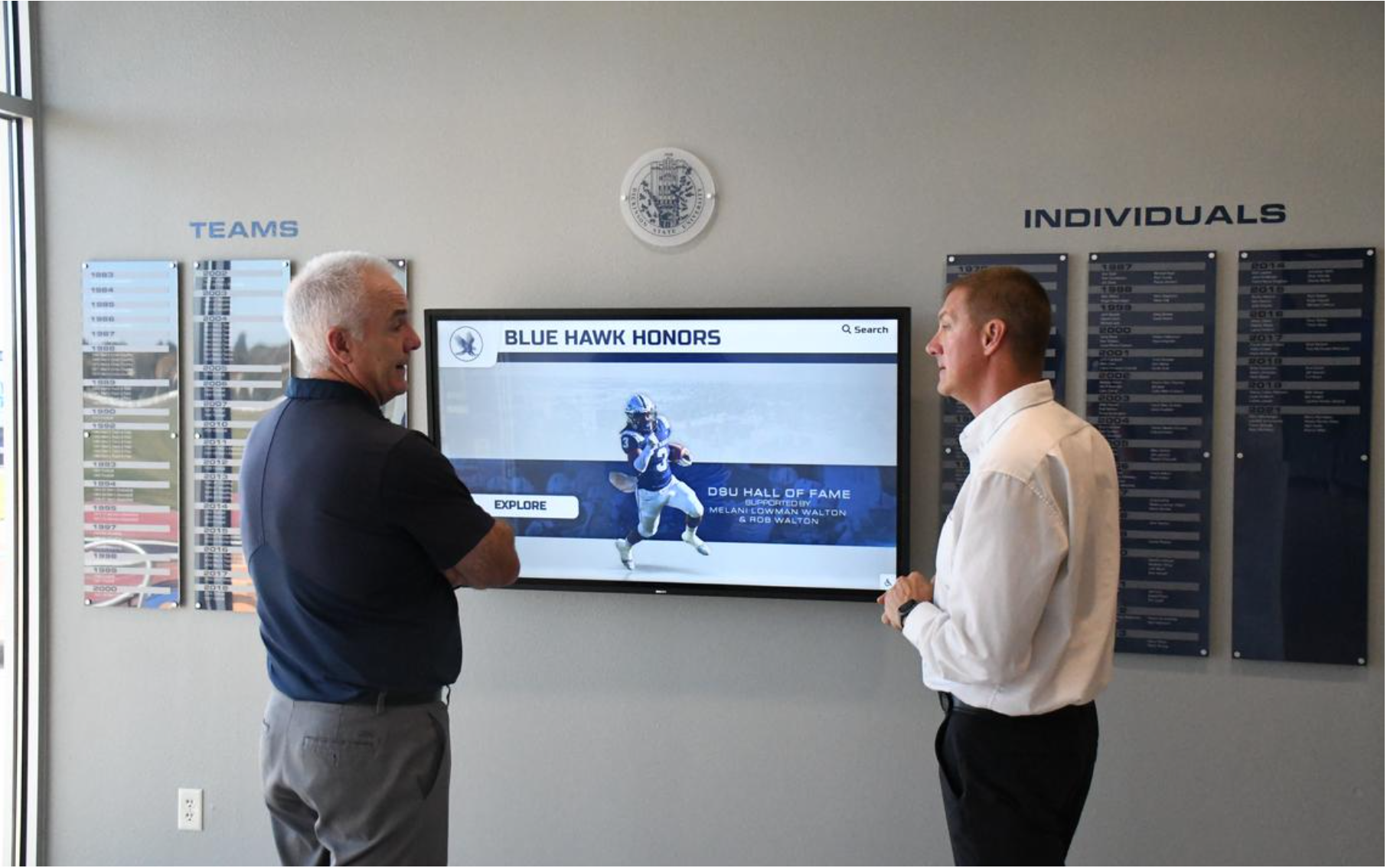 Rocket Alumni Solutions interactive digital wall of fame solution allows touch screens to display hall of fame information in a digital trophy case format. The digital wall of fame is cloud based and can display athletic awards, hall of famers, alumni recognition, letterwinners, donors, team photos, and more. Create a hall of fame or digital wall of honor with our hall of fame maker.