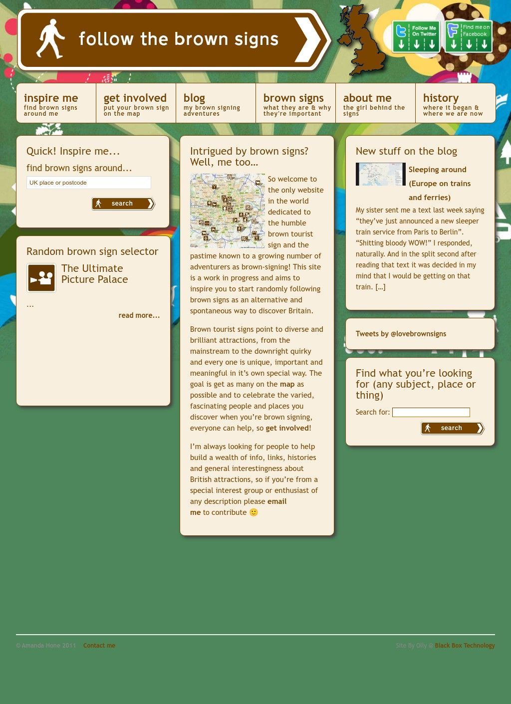 Follow the Brown Signs added on 23-Oct-2013, updated on 22-Jul-2020 | Edit Listing Aims to help tourists discover new places of interest by following the brown tourist signs around the UK. URL http://www.followthebrownsigns.com/